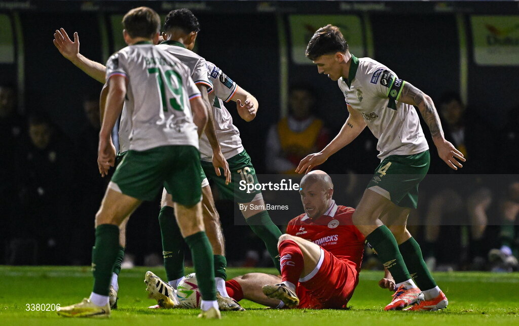 6 March 2026; Kerr McInroy of Shelbourne in action against, St Patrick's Athletic players, from left, Barry Baggley, Darragh Nugent and Joe Redmond during the SSE Airtricity Men's Premier Division match between Shelbourne and St Patrick's Athletic at Tolka Park in Dublin. Photo by Sam Barnes/Sportsfile