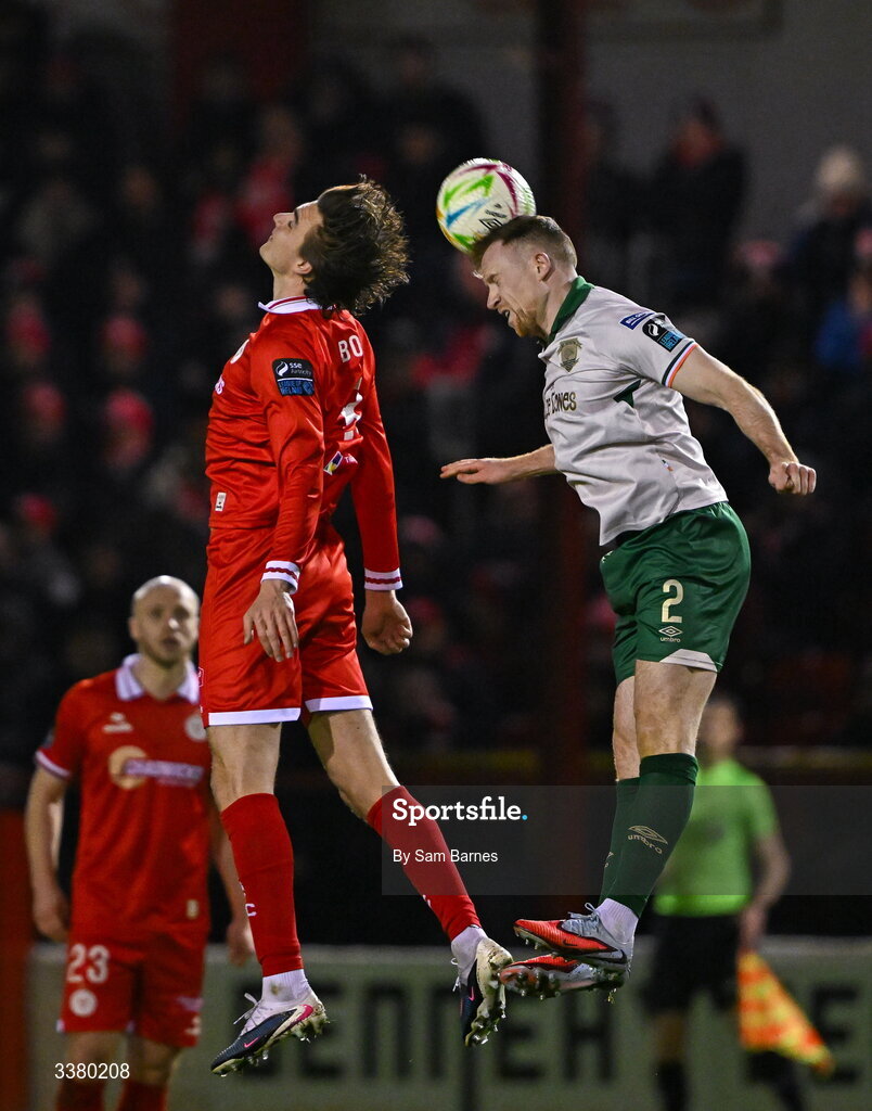 6 March 2026; Sean Hoare of St Patrick's Athletic in action against Sean Boyd of Shelbourne during the SSE Airtricity Men's Premier Division match between Shelbourne and St Patrick's Athletic at Tolka Park in Dublin. Photo by Sam Barnes/Sportsfile