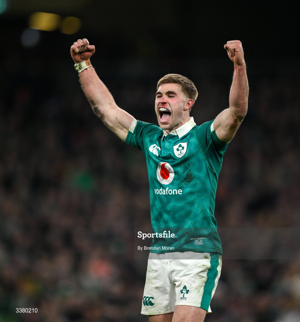6 March 2026; Jack Crowley of Ireland celebrates winning a turnover during the Guinness 6 Nations Rugby Championship match between Ireland and Wales at the Aviva Stadium in Dublin. Photo by Brendan Moran/Sportsfile