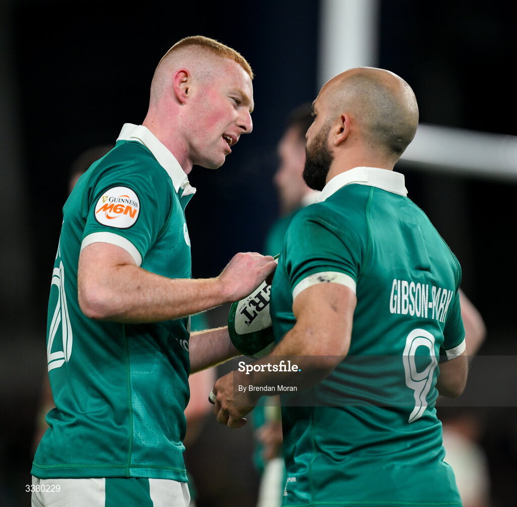 6 March 2026; Ireland players Nathan Doak, left, and Jamison Gibson-Park during the Guinness 6 Nations Rugby Championship match between Ireland and Wales at the Aviva Stadium in Dublin. Photo by Brendan Moran/Sportsfile