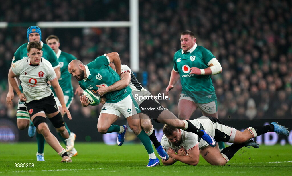 6 March 2026; Jamison Gibson-Park of Ireland is tackled by Wales players Tomas Francis, left, and Tomos Williams during the Guinness 6 Nations Rugby Championship match between Ireland and Wales at the Aviva Stadium in Dublin. Photo by Brendan Moran/Sportsfile