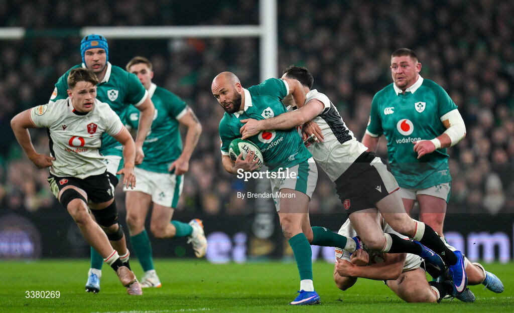 6 March 2026; Jamison Gibson-Park of Ireland is tackled by Wales players Tomas Francis, left, and Tomos Williams during the Guinness 6 Nations Rugby Championship match between Ireland and Wales at the Aviva Stadium in Dublin. Photo by Brendan Moran/Sportsfile