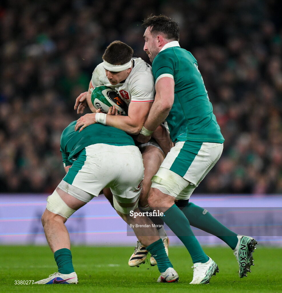 6 March 2026; Joe Hawkins of Wales is tackled by Ireland players Jack Conan, right, and Nick Timoney during the Guinness 6 Nations Rugby Championship match between Ireland and Wales at the Aviva Stadium in Dublin. Photo by Brendan Moran/Sportsfile