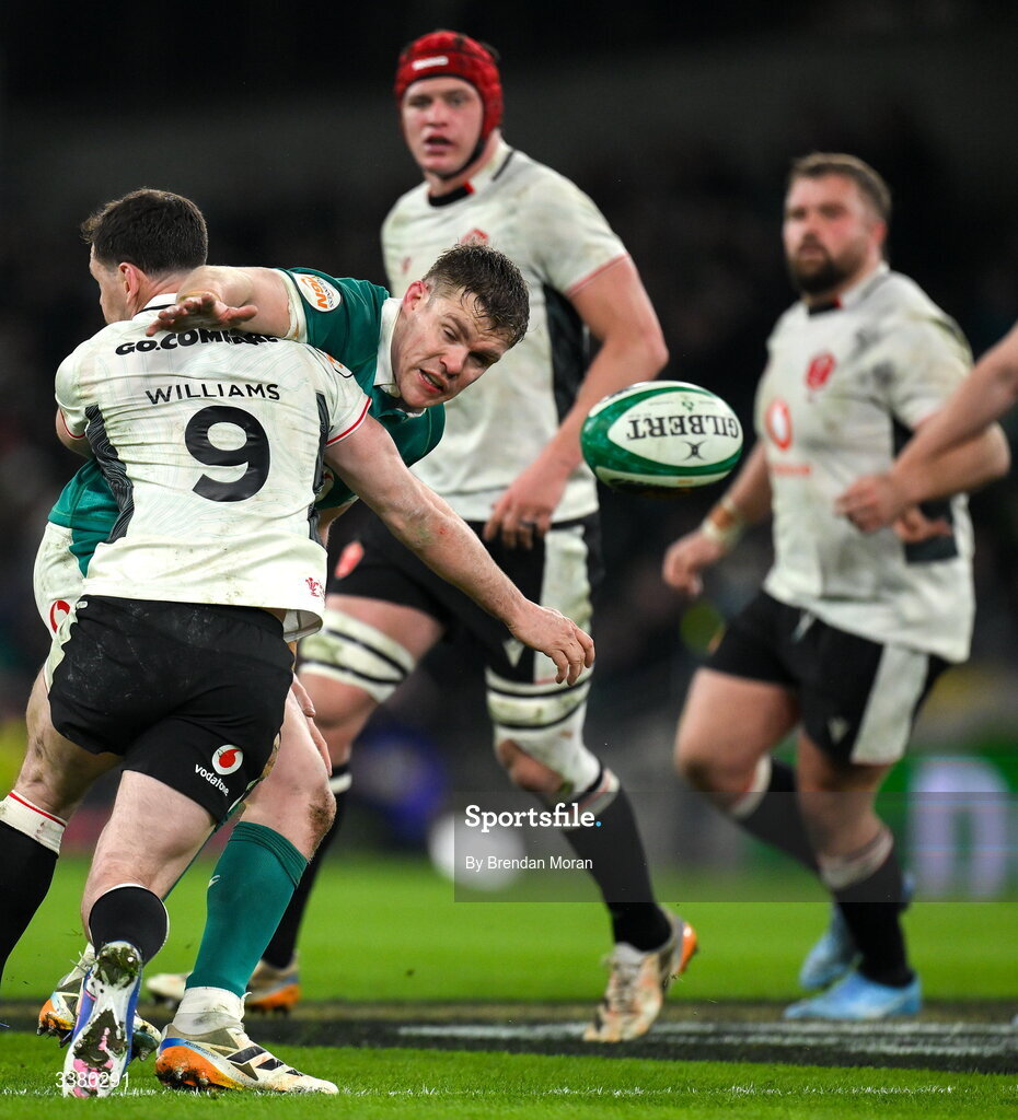 6 March 2026; Garry Ringrose of Ireland is tackled by Tomos Williams of Wales during the Guinness 6 Nations Rugby Championship match between Ireland and Wales at the Aviva Stadium in Dublin. Photo by Brendan Moran/Sportsfile