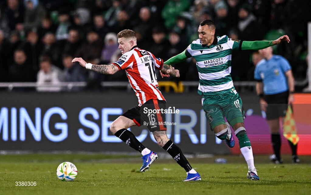 6 March 2026; James McClean of Derry City in action against Graham Burke of Shamrock Rovers during the SSE Airtricity Men's Premier Division match between Shamrock Rovers and Derry City at Tallaght Stadium in Dublin. Photo by Ben McShane/Sportsfile