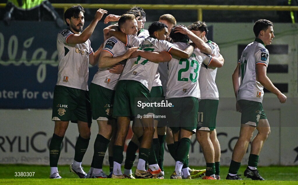 6 March 2026; St Patrick's Athletic players celebrate after scoring their second goal, scored by Ryan Edmondson during the SSE Airtricity Men's Premier Division match between Shelbourne and St Patrick's Athletic at Tolka Park in Dublin. Photo by Sam Barnes/Sportsfile