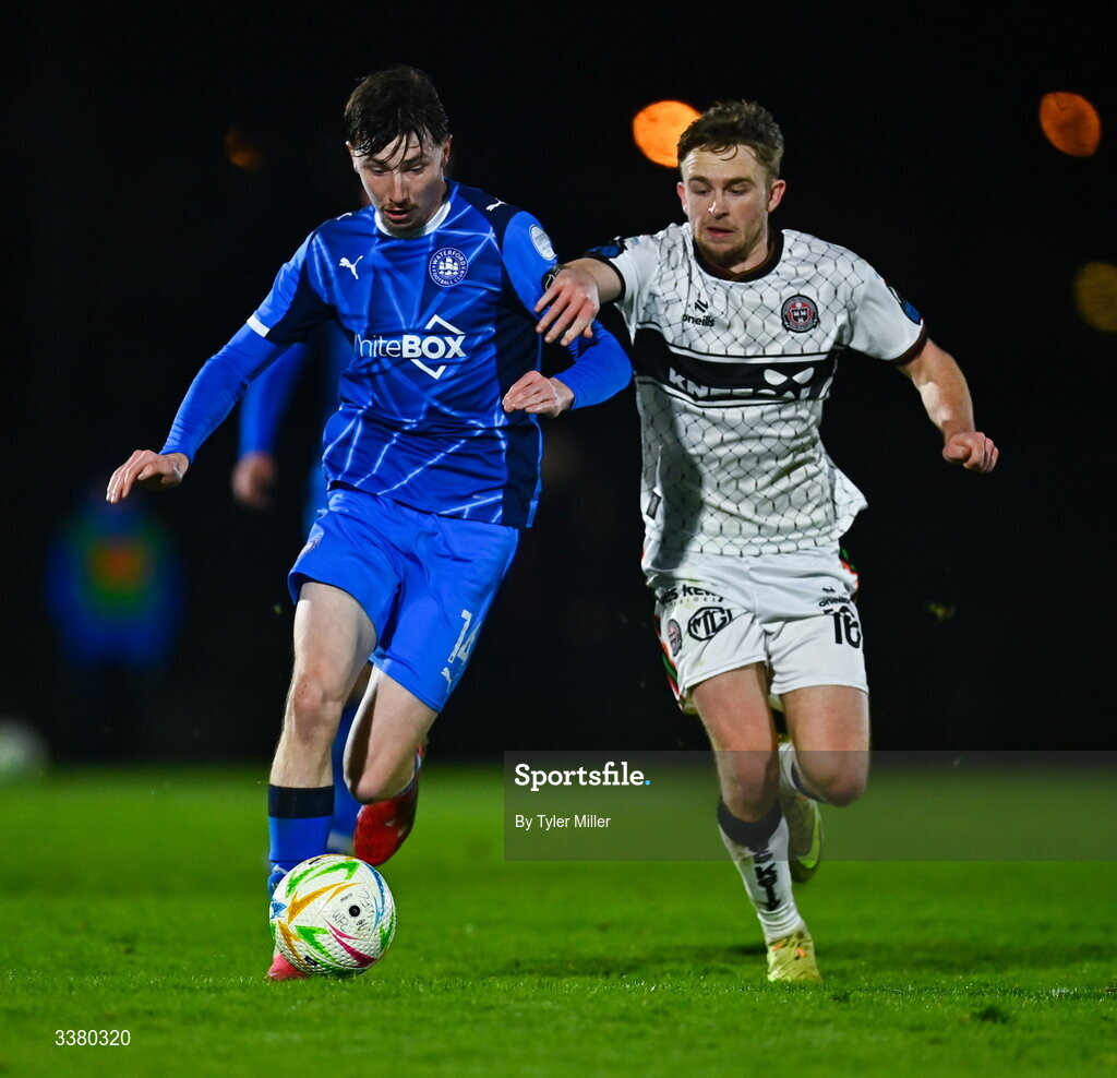 6 March 2026; Jesse Dempsey of Waterford in action against Darragh Power of Bohemians during the SSE Airtricity Men's Premier Division match between Waterford and Bohemians at the RSC in Waterford. Photo by Tyler Miller/Sportsfile