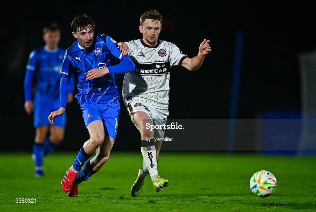 6 March 2026; Jesse Dempsey of Waterford in action against Darragh Power of Bohemians during the SSE Airtricity Men's Premier Division match between Waterford and Bohemians at the RSC in Waterford. Photo by Tyler Miller/Sportsfile