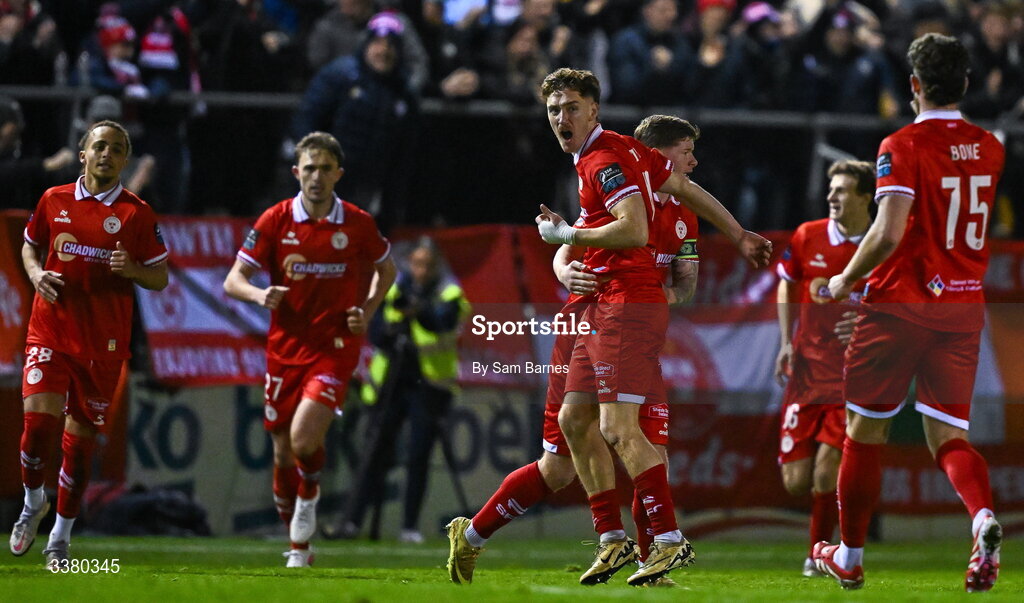 6 March 2026; John Martin of Shelbourne, centre, celebrates with teammates after scoring his side's second goal during the SSE Airtricity Men's Premier Division match between Shelbourne and St Patrick's Athletic at Tolka Park in Dublin. Photo by Sam Barnes/Sportsfile