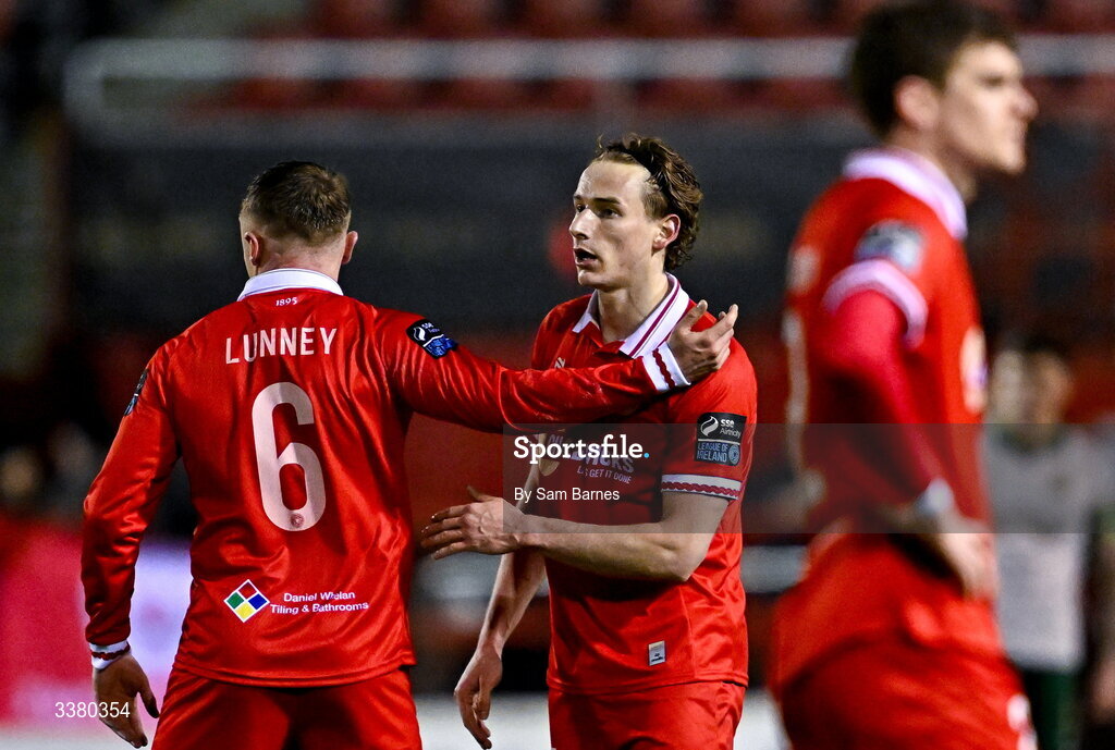 6 March 2026; Harry Wood of Shelbourne, centre, celebrates with JJ Lunney after scoring his side's first goal during the SSE Airtricity Men's Premier Division match between Shelbourne and St Patrick's Athletic at Tolka Park in Dublin. Photo by Sam Barnes/Sportsfile