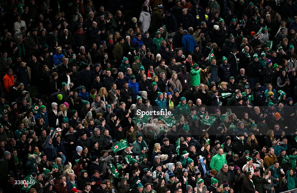 6 March 2026; Ireland supporters celebrate their side's fourth try during the Guinness 6 Nations Rugby Championship match between Ireland and Wales at the Aviva Stadium in Dublin. Photo by David Fitzgerald/Sportsfile