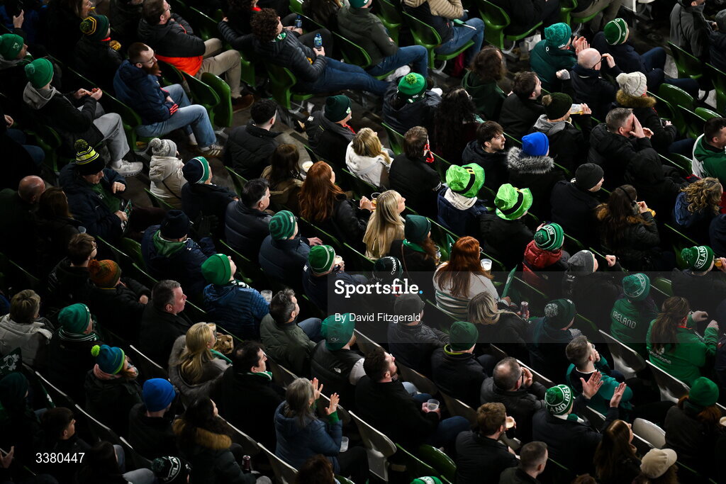 6 March 2026; Ireland supporters during the Guinness 6 Nations Rugby Championship match between Ireland and Wales at the Aviva Stadium in Dublin. Photo by David Fitzgerald/Sportsfile