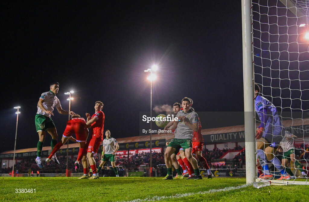 6 March 2026; Max Mata of St Patrick's Athletic, left, scores his side's third goal despite the efforts of Evan Caffrey of Shelbourne during the SSE Airtricity Men's Premier Division match between Shelbourne and St Patrick's Athletic at Tolka Park in Dublin. Photo by Sam Barnes/Sportsfile