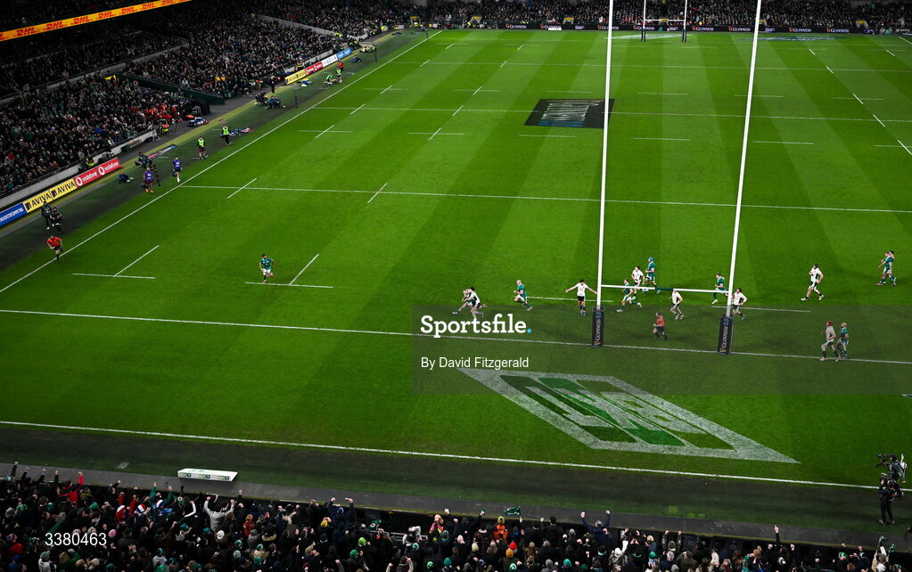 6 March 2026; Jamie Osborne of Ireland scores his side's fourth try during the Guinness 6 Nations Rugby Championship match between Ireland and Wales at the Aviva Stadium in Dublin. Photo by David Fitzgerald/Sportsfile