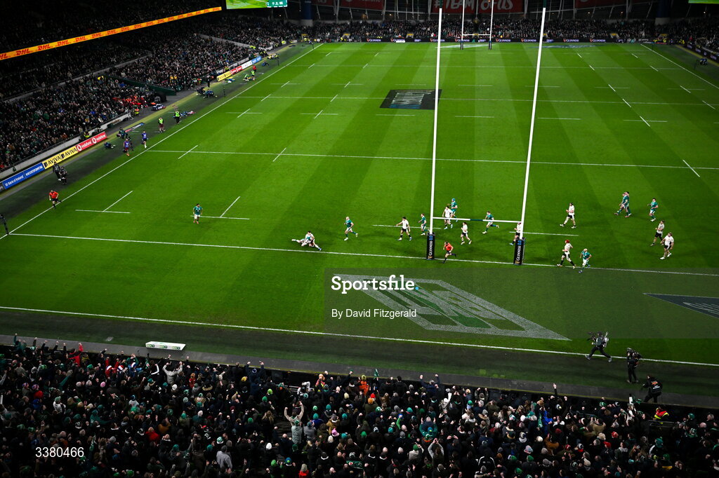 6 March 2026; Jamie Osborne of Ireland scores his side's fourth try during the Guinness 6 Nations Rugby Championship match between Ireland and Wales at the Aviva Stadium in Dublin. Photo by David Fitzgerald/Sportsfile
