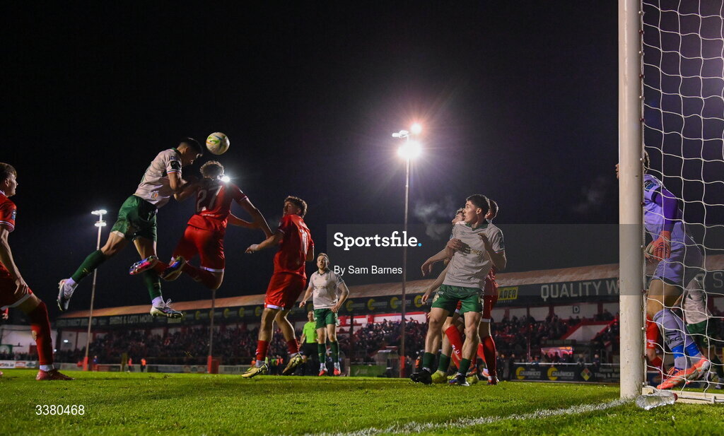 6 March 2026; Max Mata of St Patrick's Athletic, left, scores his side's third goal despite the efforts of Evan Caffrey of Shelbourne during the SSE Airtricity Men's Premier Division match between Shelbourne and St Patrick's Athletic at Tolka Park in Dublin. Photo by Sam Barnes/Sportsfile