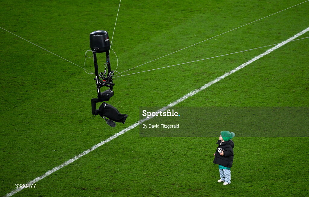 6 March 2026; Jai Gibson-Park, son of Jamison Gibson-Park of Ireland, looks at a TV camera after the Guinness 6 Nations Rugby Championship match between Ireland and Wales at the Aviva Stadium in Dublin. Photo by David Fitzgerald/Sportsfile