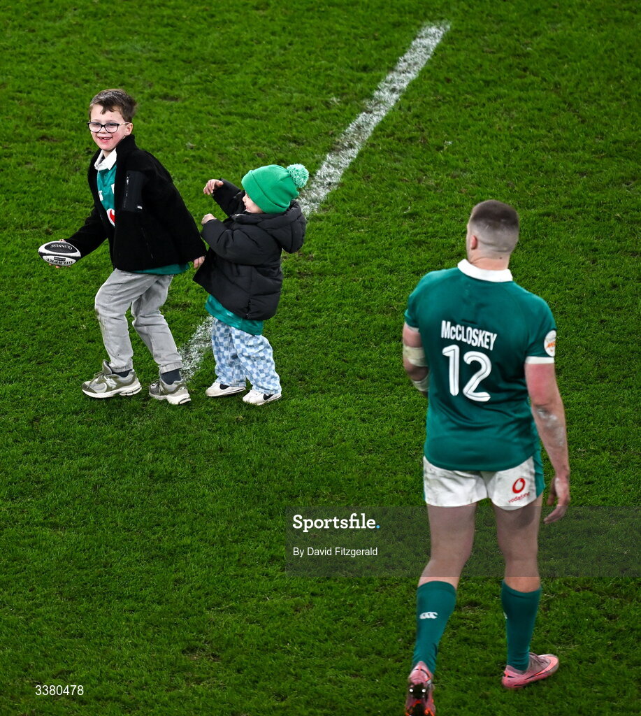 6 March 2026; Arlo McCloskey, son of Stuart McCloskey of Ireland, left, and Jai Gibson-Park, son of Jamison Gibson-Park of Ireland, play together after the Guinness 6 Nations Rugby Championship match between Ireland and Wales at the Aviva Stadium in Dublin. Photo by David Fitzgerald/Sportsfile