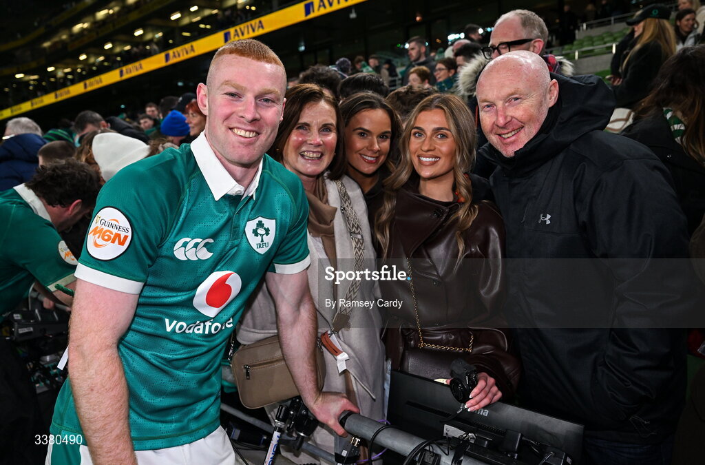 6 March 2026; Nathan Doak of Ireland with friends and family after his side's victory in the Guinness 6 Nations Rugby Championship match between Ireland and Wales at the Aviva Stadium in Dublin. Photo by Ramsey Cardy/Sportsfile