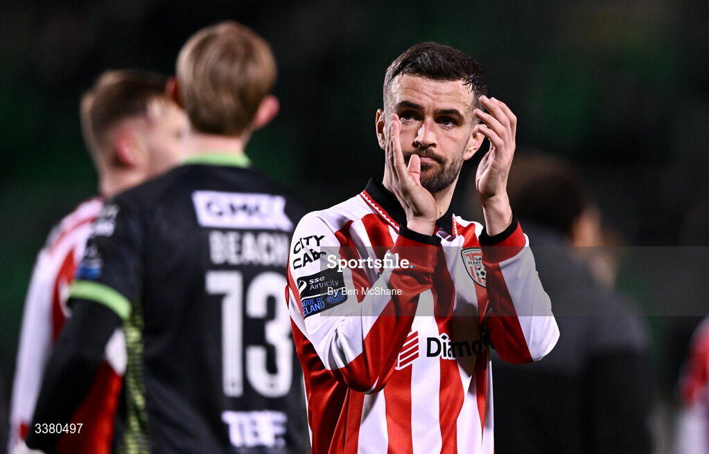 6 March 2026; Derry City captain Michael Duffy applaud to the supporters after the SSE Airtricity Men's Premier Division match between Shamrock Rovers and Derry City at Tallaght Stadium in Dublin. Photo by Ben McShane/Sportsfile