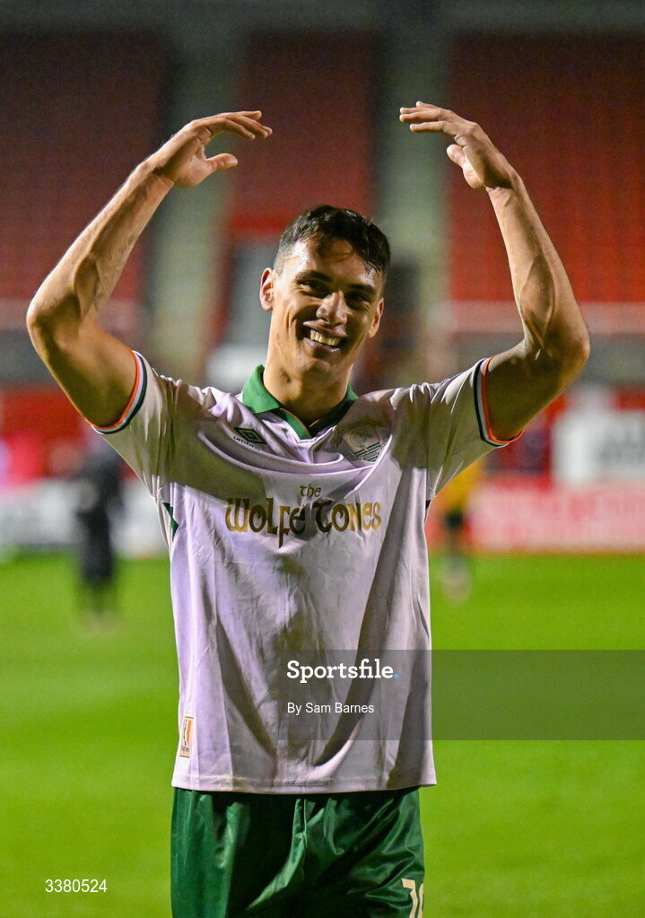 6 March 2026; Max Mata of St Patrick's Athletic celebrates after his side's victory in the SSE Airtricity Men's Premier Division match between Shelbourne and St Patrick's Athletic at Tolka Park in Dublin. Photo by Sam Barnes/Sportsfile
