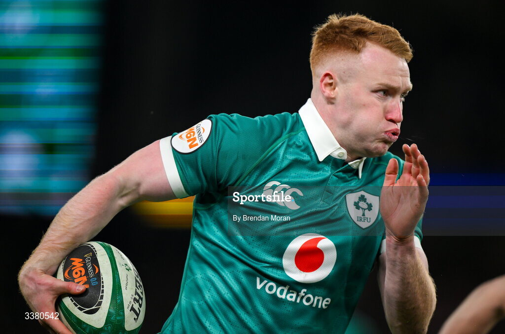 6 March 2026; Ciarán Frawley of Ireland during the Guinness 6 Nations Rugby Championship match between Ireland and Wales at the Aviva Stadium in Dublin. Photo by Brendan Moran/Sportsfile