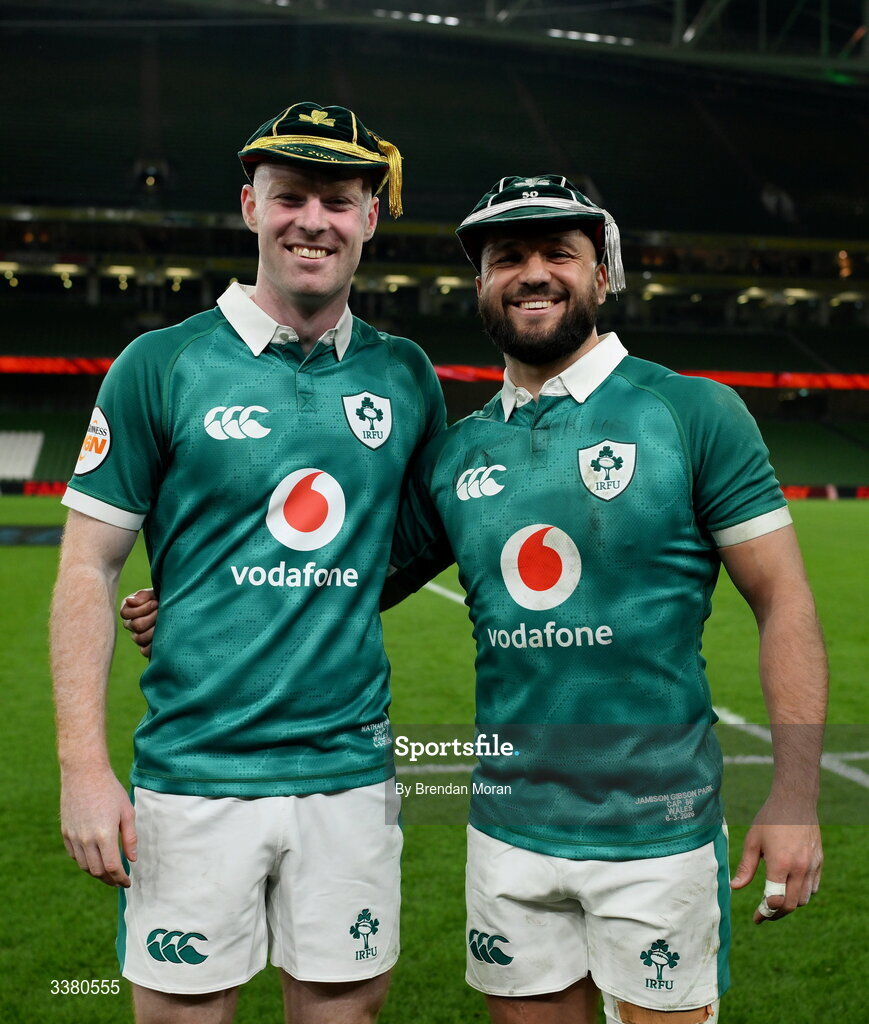 6 March 2026; Ireland players Nathan Doak, left, with his first cap and Jamison Gibson-Park, with his 50th cap, after the Guinness 6 Nations Rugby Championship match between Ireland and Wales at the Aviva Stadium in Dublin. Photo by Brendan Moran/Sportsfile