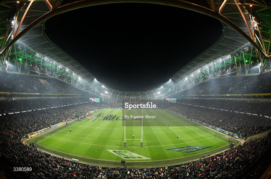6 March 2026; A general view during the anthems before the Guinness 6 Nations Rugby Championship match between Ireland and Wales at the Aviva Stadium in Dublin. Photo by Brendan Moran/Sportsfile