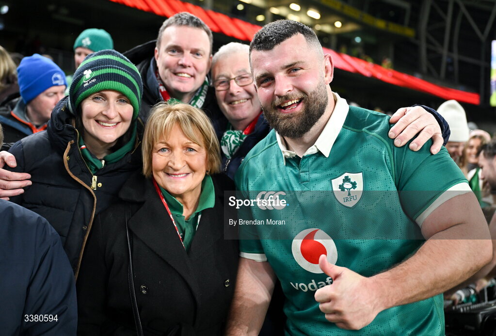 6 March 2026; Michael Milne of Ireland with his family after the Guinness 6 Nations Rugby Championship match between Ireland and Wales at the Aviva Stadium in Dublin. Photo by Brendan Moran/Sportsfile
