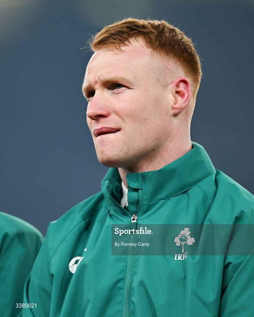6 March 2026; Ciarán Frawley of Ireland before the Guinness 6 Nations Rugby Championship match between Ireland and Wales at the Aviva Stadium in Dublin. Photo by Ramsey Cardy/Sportsfile