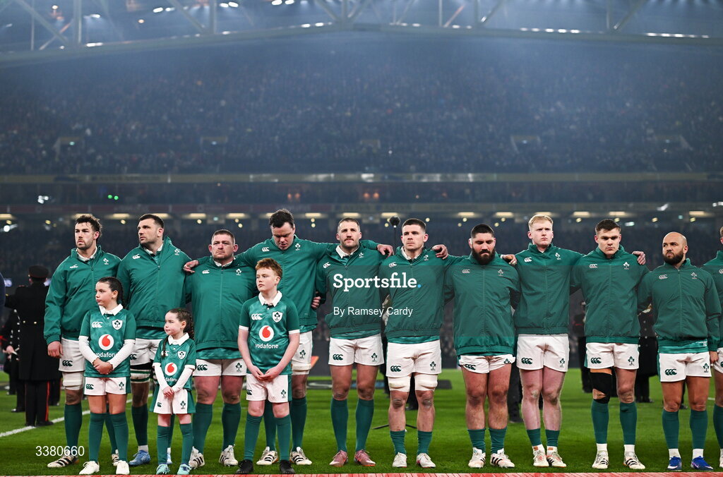 6 March 2026; Ireland players, from left, Caelan Doris, Tadhg Beirne, Tadhg Furlong, James Ryan, Stuart McCloskey, Nick Timoney Tom O’Toole, Jamie Osborne, Garry Ringrose and Jamison Gibson-Park before the Guinness 6 Nations Rugby Championship match between Ireland and Wales at the Aviva Stadium in Dublin. Photo by Ramsey Cardy/Sportsfile