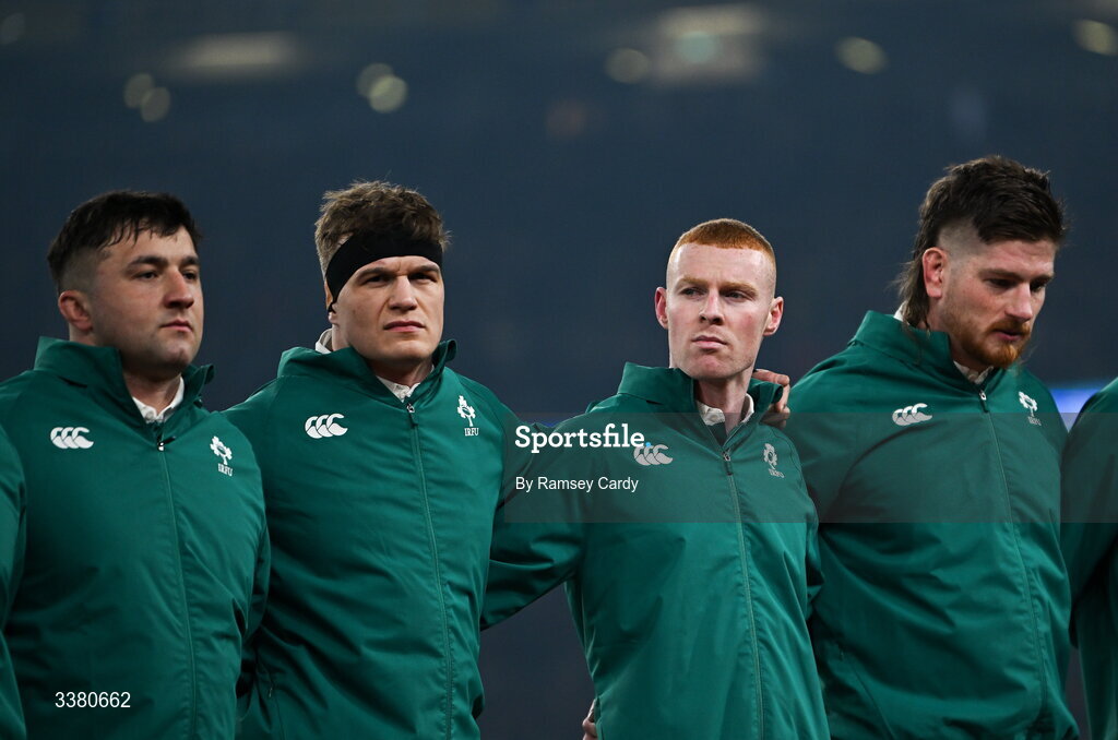 6 March 2026; Ireland players, from left, Thomas Clarkson, Josh van der Flier, Nathan Doak and Joe McCarthy before the Guinness 6 Nations Rugby Championship match between Ireland and Wales at the Aviva Stadium in Dublin. Photo by Ramsey Cardy/Sportsfile