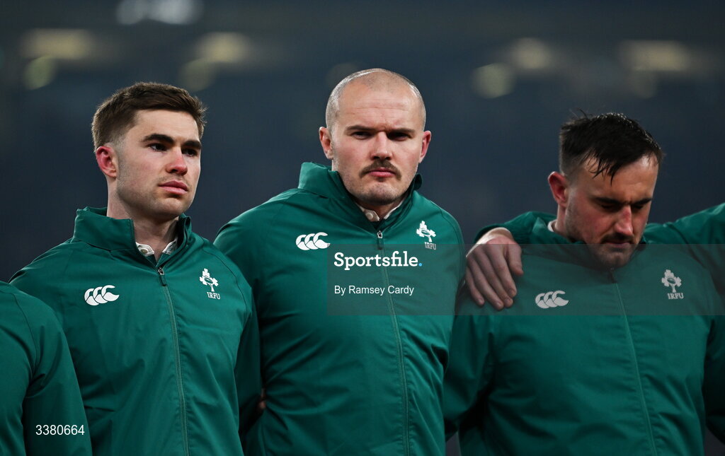 6 March 2026; Ireland players, from left, Jack Crowley, Jacob Stockdale and Rónan Kelleher before the Guinness 6 Nations Rugby Championship match between Ireland and Wales at the Aviva Stadium in Dublin. Photo by Ramsey Cardy/Sportsfile