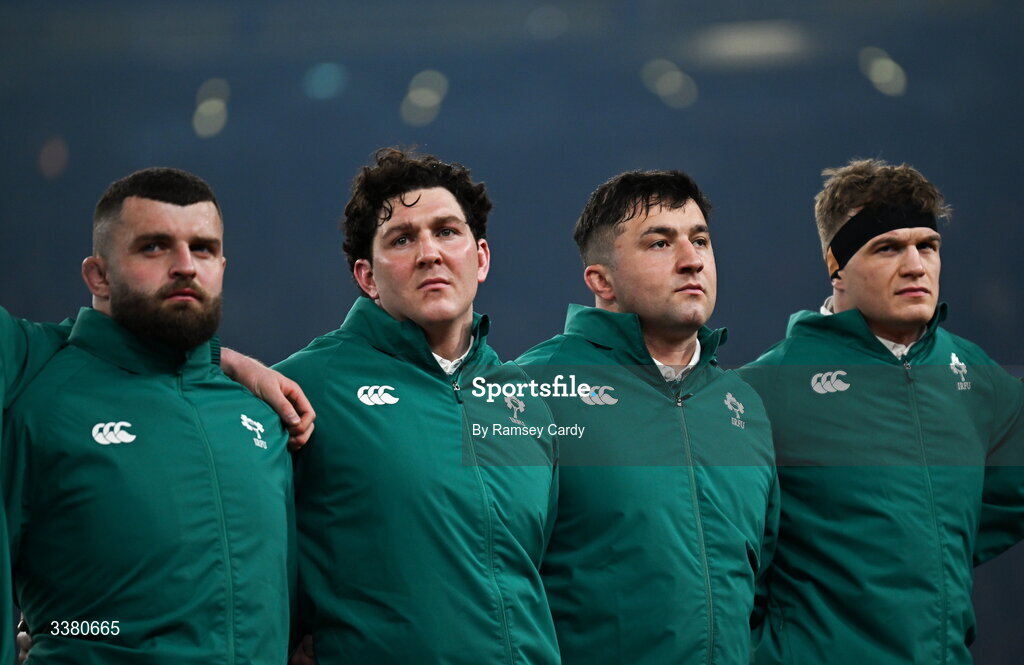 6 March 2026; Ireland players, from left, Michael Milne, Tom Stewart, Thomas Clarkson and Josh van der Flier before the Guinness 6 Nations Rugby Championship match between Ireland and Wales at the Aviva Stadium in Dublin. Photo by Ramsey Cardy/Sportsfile