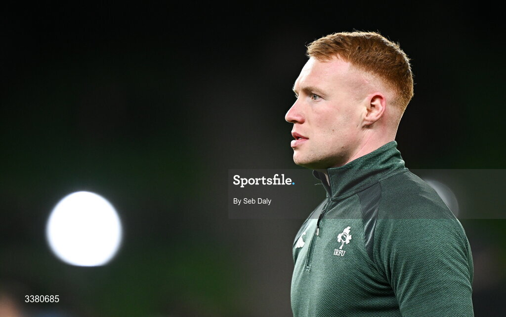 6 March 2026; Ciarán Frawley of Ireland before the Guinness 6 Nations Rugby Championship match between Ireland and Wales at the Aviva Stadium in Dublin. Photo by Seb Daly/Sportsfile