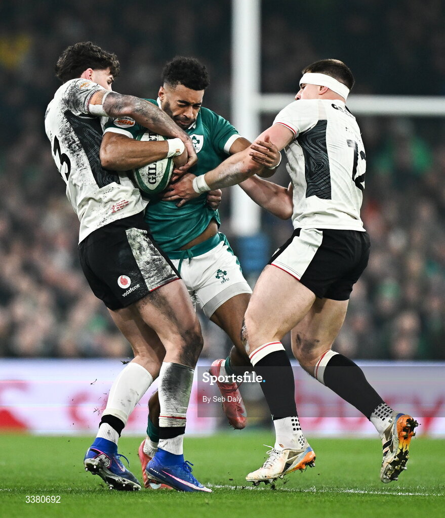 6 March 2026; Robert Baloucoune of Ireland is tackled by Wales players Eddie James, left, and Joe Hawkins during the Guinness 6 Nations Rugby Championship match between Ireland and Wales at the Aviva Stadium in Dublin. Photo by Seb Daly/Sportsfile
