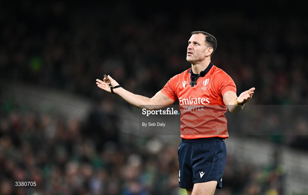 6 March 2026; Referee Karl Dickson during the Guinness 6 Nations Rugby Championship match between Ireland and Wales at the Aviva Stadium in Dublin. Photo by Seb Daly/Sportsfile