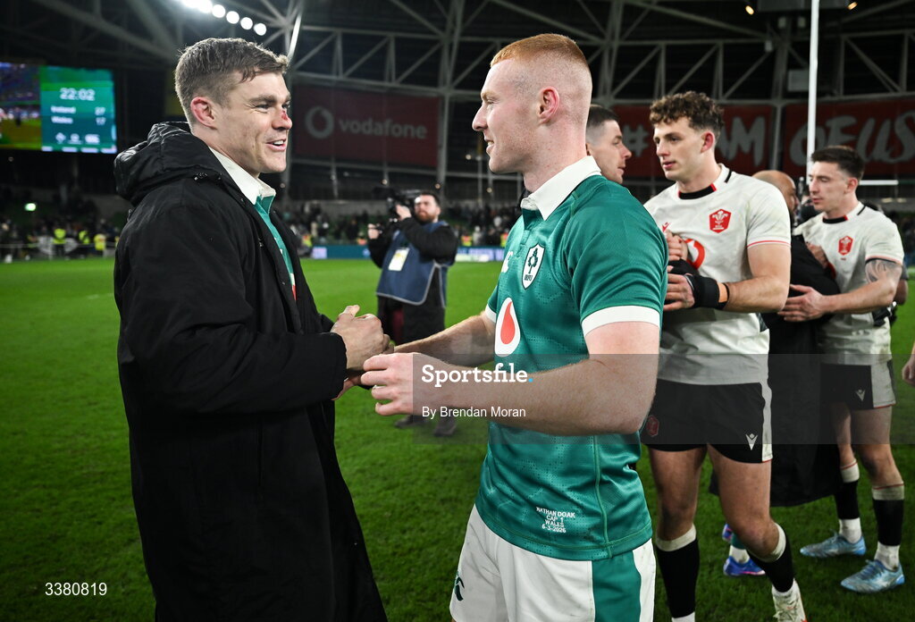6 March 2026; Garry Ringrose, left, and Nathan Doak of Ireland after the Guinness 6 Nations Rugby Championship match between Ireland and Wales at the Aviva Stadium in Dublin. Photo by Brendan Moran/Sportsfile