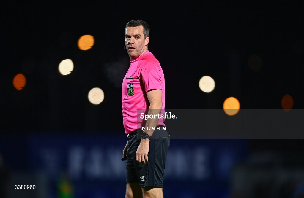 6 March 2026; Referee Robert Harvey during the SSE Airtricity Men's Premier Division match between Waterford and Bohemians at the RSC in Waterford. Photo by Tyler Miller/Sportsfile