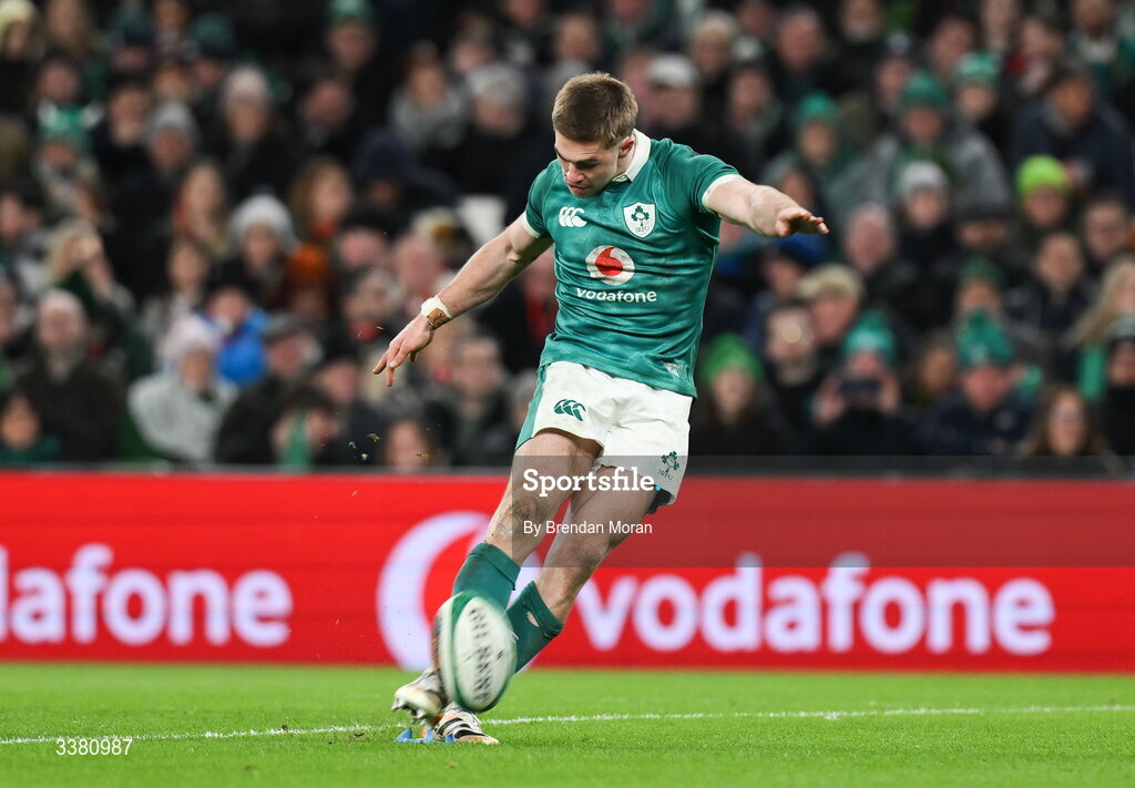6 March 2026; Jack Crowley of Ireland kicks a conversion during the Guinness 6 Nations Rugby Championship match between Ireland and Wales at the Aviva Stadium in Dublin. Photo by Brendan Moran/Sportsfile