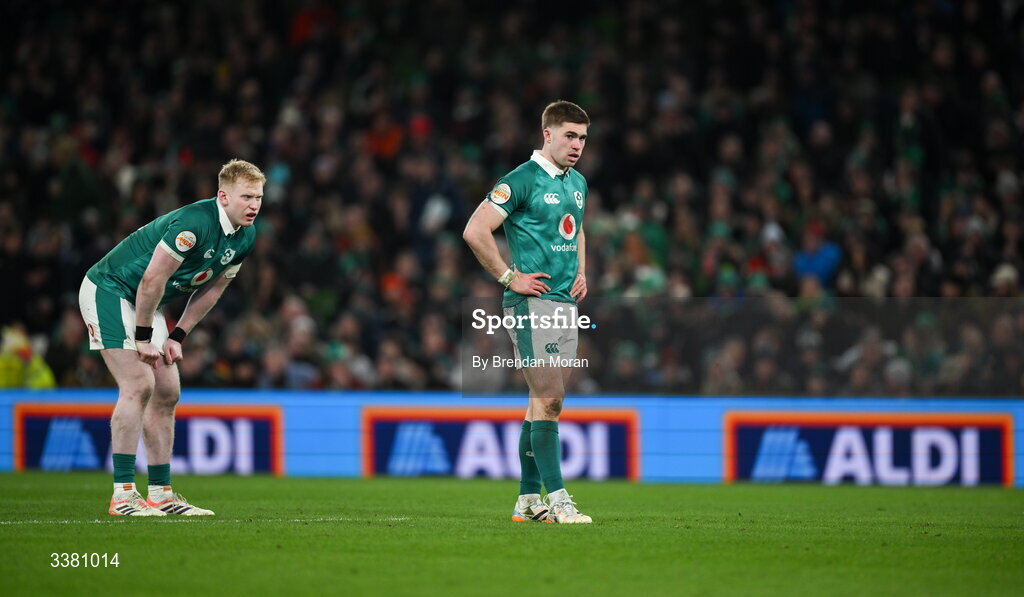 6 March 2026; Jack Crowley, centre, and Jamie Osborne of Ireland during the Guinness 6 Nations Rugby Championship match between Ireland and Wales at the Aviva Stadium in Dublin. Photo by Brendan Moran/Sportsfile
