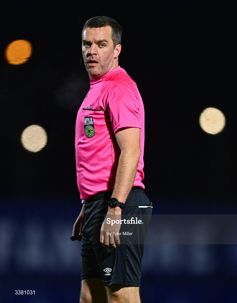 6 March 2026; Referee Robert Harvey during the SSE Airtricity Men's Premier Division match between Waterford and Bohemians at the RSC in Waterford. Photo by Tyler Miller/Sportsfile