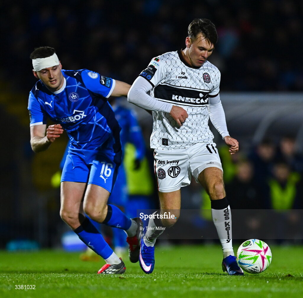 6 March 2026; Dayle Rooney of Bohemians in action against Hayden Cann of Waterford during the SSE Airtricity Men's Premier Division match between Waterford and Bohemians at the RSC in Waterford. Photo by Tyler Miller/Sportsfile