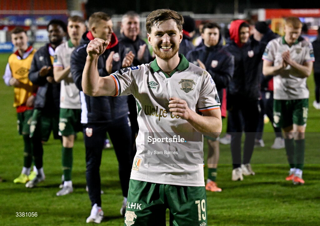 6 March 2026; Barry Baggley of St Patrick's Athletic celebrates after his side's victory in the SSE Airtricity Men's Premier Division match between Shelbourne and St Patrick's Athletic at Tolka Park in Dublin. Photo by Sam Barnes/Sportsfile