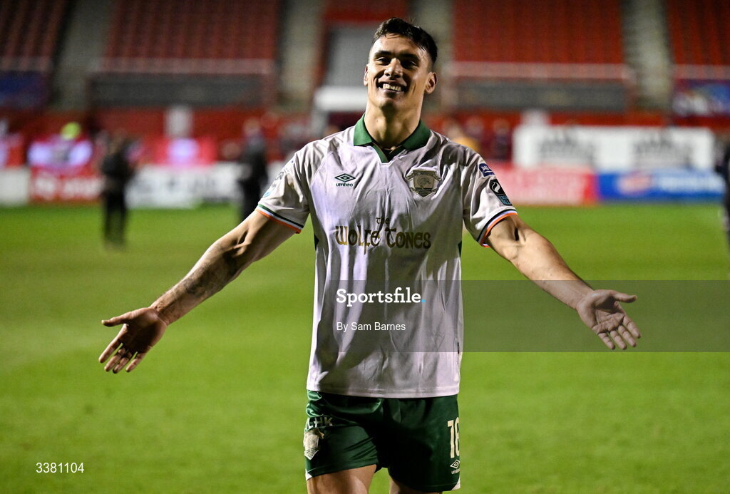 6 March 2026; Max Mata of St Patrick's Athletic celebrates after his side's victory in the SSE Airtricity Men's Premier Division match between Shelbourne and St Patrick's Athletic at Tolka Park in Dublin. Photo by Sam Barnes/Sportsfile
