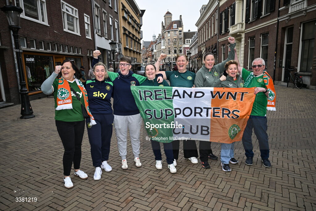 7 March 2026; Republic of Ireland supporters, from left, Ethyl Larkin, Katie Melady, Laura Matthews, Maura Tarrant, Lisa McCarthy, Aisling Hyland, Lisa Cox and Robert Larkin in Utrecht ahead of their side's 2027 FIFA Women’s World Cup Qualifier match against Netherlands at Stadion Galgenwaard in Utrecht, Netherlands. Photo by Stephen McCarthy/Sportsfile