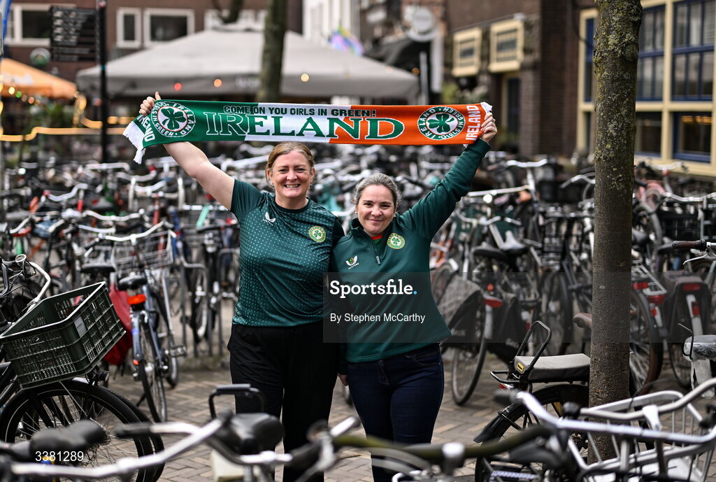 7 March 2026; Republic of Ireland supporters, from left, Lisa McCarthy, left, and Maura Tarrant in Utrecht ahead of their side's 2027 FIFA Women’s World Cup Qualifier match against Netherlands at Stadion Galgenwaard in Utrecht, Netherlands. Photo by Stephen McCarthy/Sportsfile