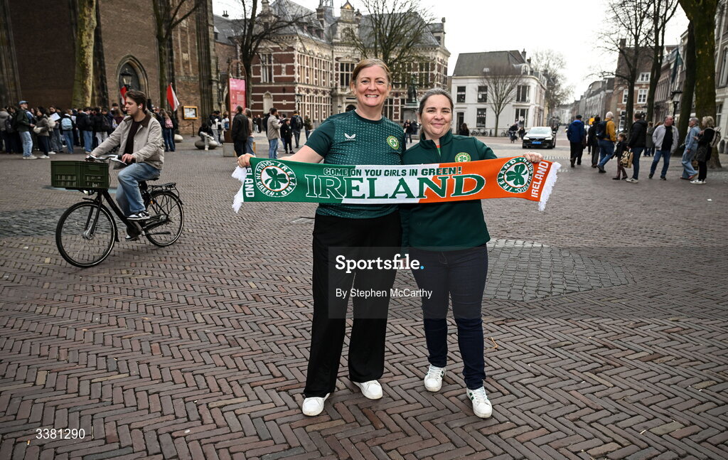 7 March 2026; Republic of Ireland supporters, from left, Lisa McCarthy, left, and Maura Tarrant in Utrecht ahead of their side's 2027 FIFA Women’s World Cup Qualifier match against Netherlands at Stadion Galgenwaard in Utrecht, Netherlands. Photo by Stephen McCarthy/Sportsfile