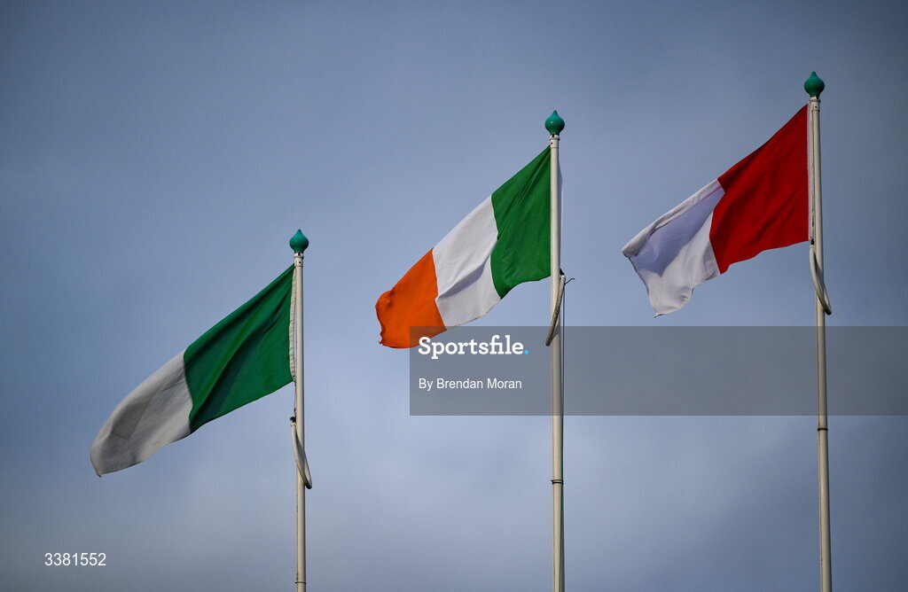 7 March 2026; The Limerick, Irish tricolour and Cork flags fly in the wind before the Allianz Hurling League Division 1A match between Limerick and Cork at TUS Gaelic Grounds in Limerick. Photo by Brendan Moran/Sportsfile