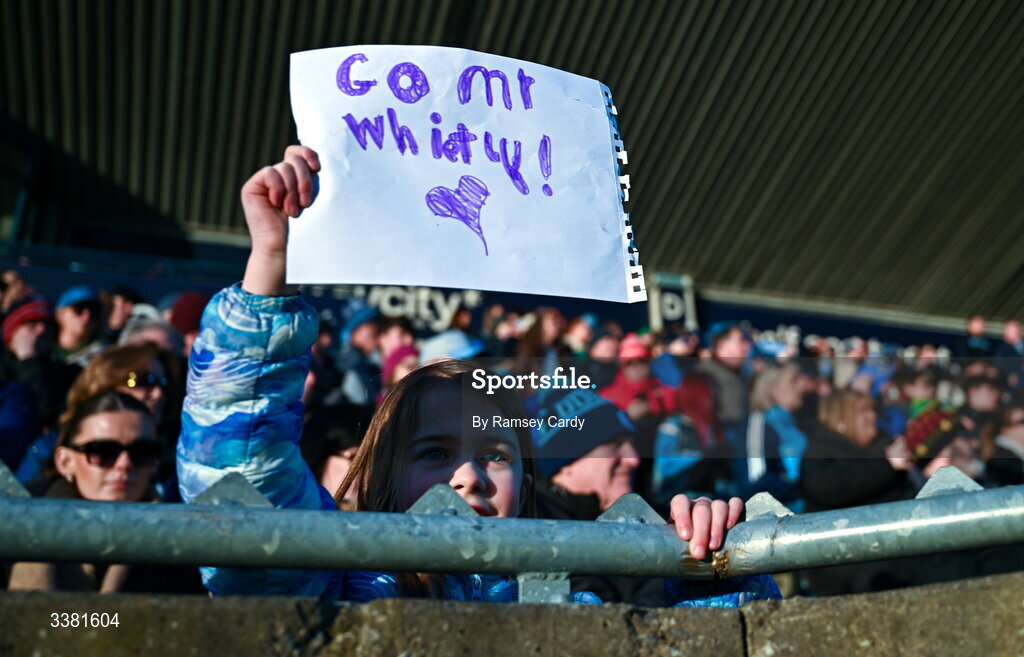 7 March 2026; A supporter holds a sign for Fergal Whitely of Dublin during the Allianz Hurling League Division 1B match between Dublin and Down at Parnell Park in Dublin. Photo by Ramsey Cardy/Sportsfile